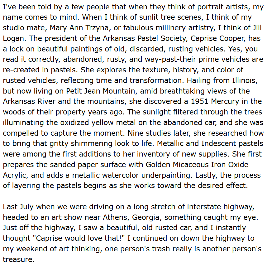 Since then, Jean has joined the Arkansas Pastel Society, and whenever she has a painting included in one of our exhibitions, she makes the trip to be part of it. Her dedication to her work and to the art community is inspiring. I highly encourage you to visit her website and explore her beautiful work.
