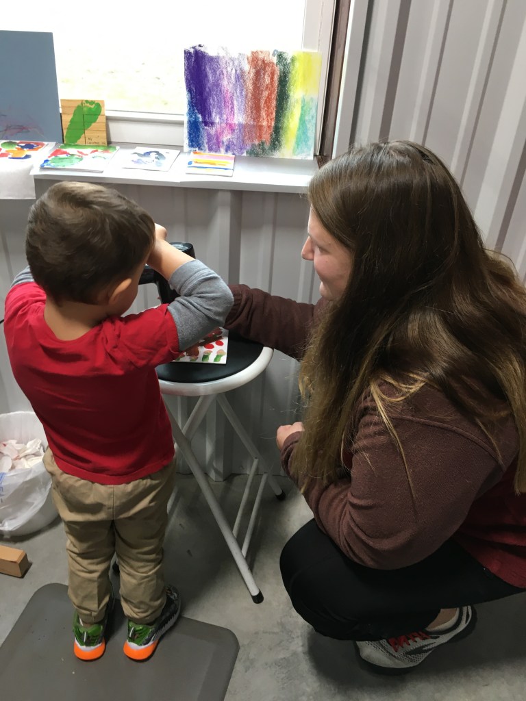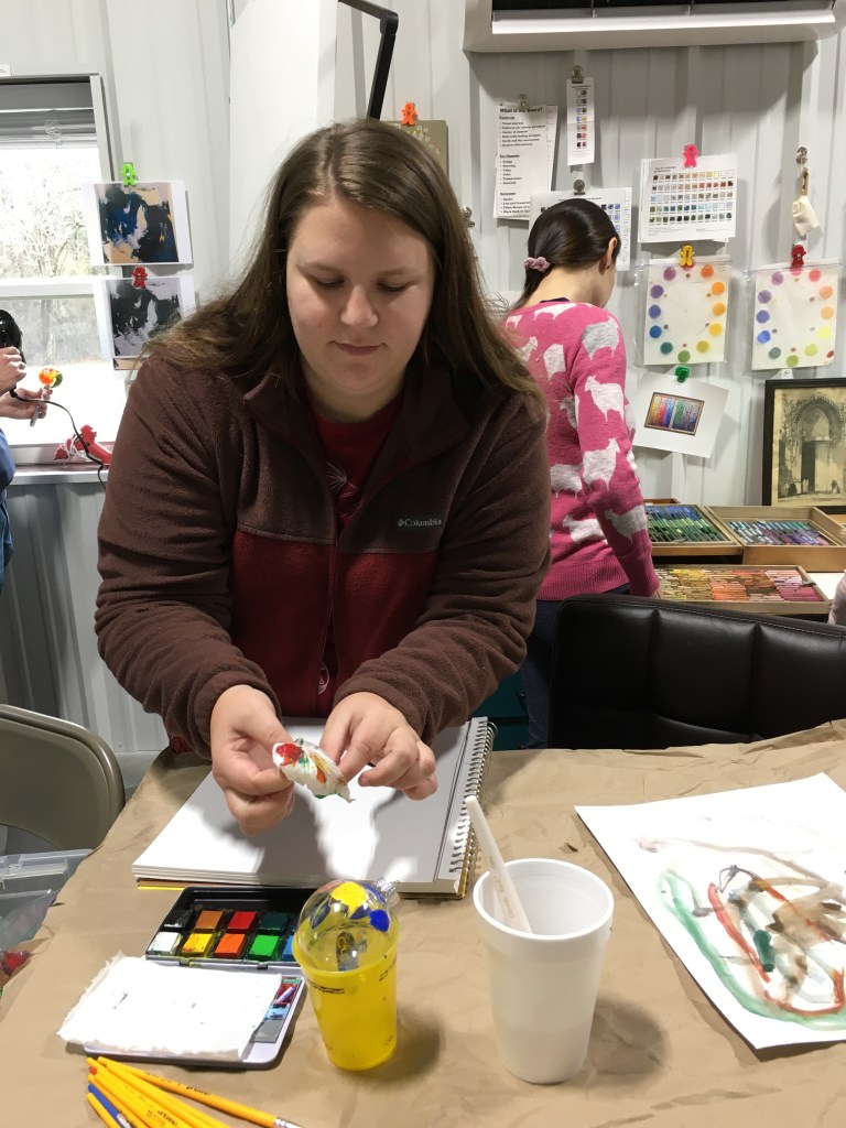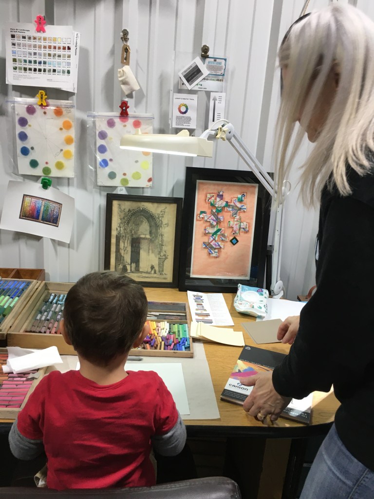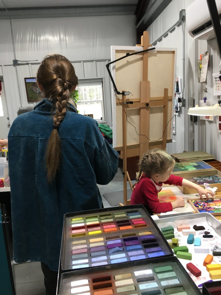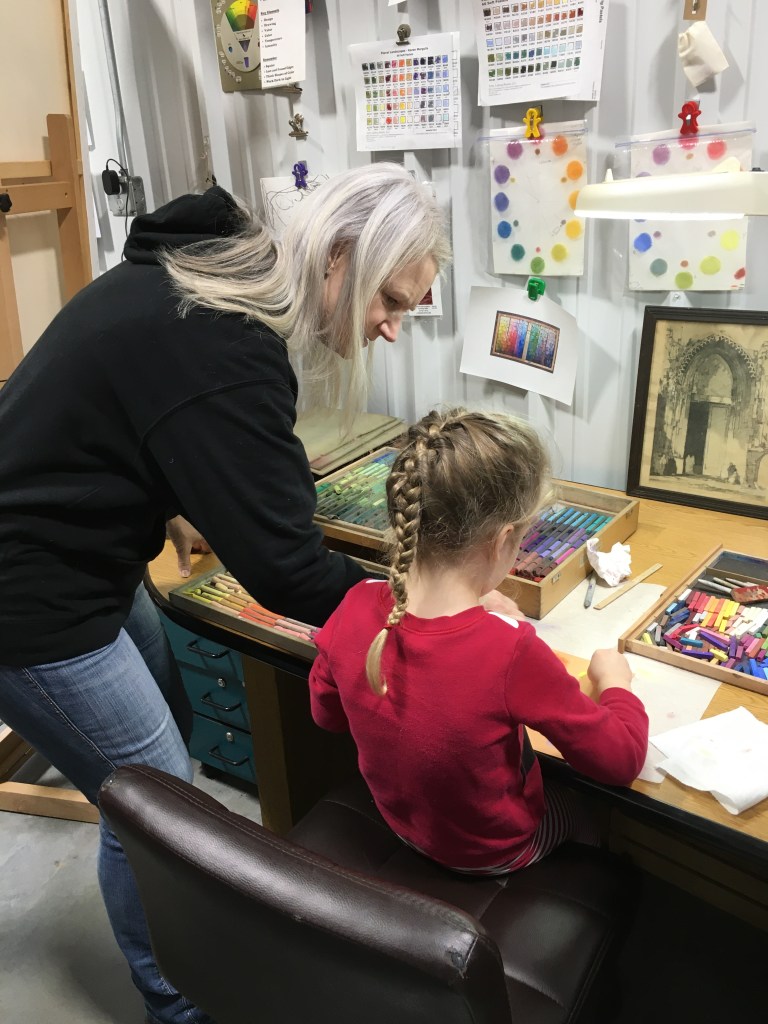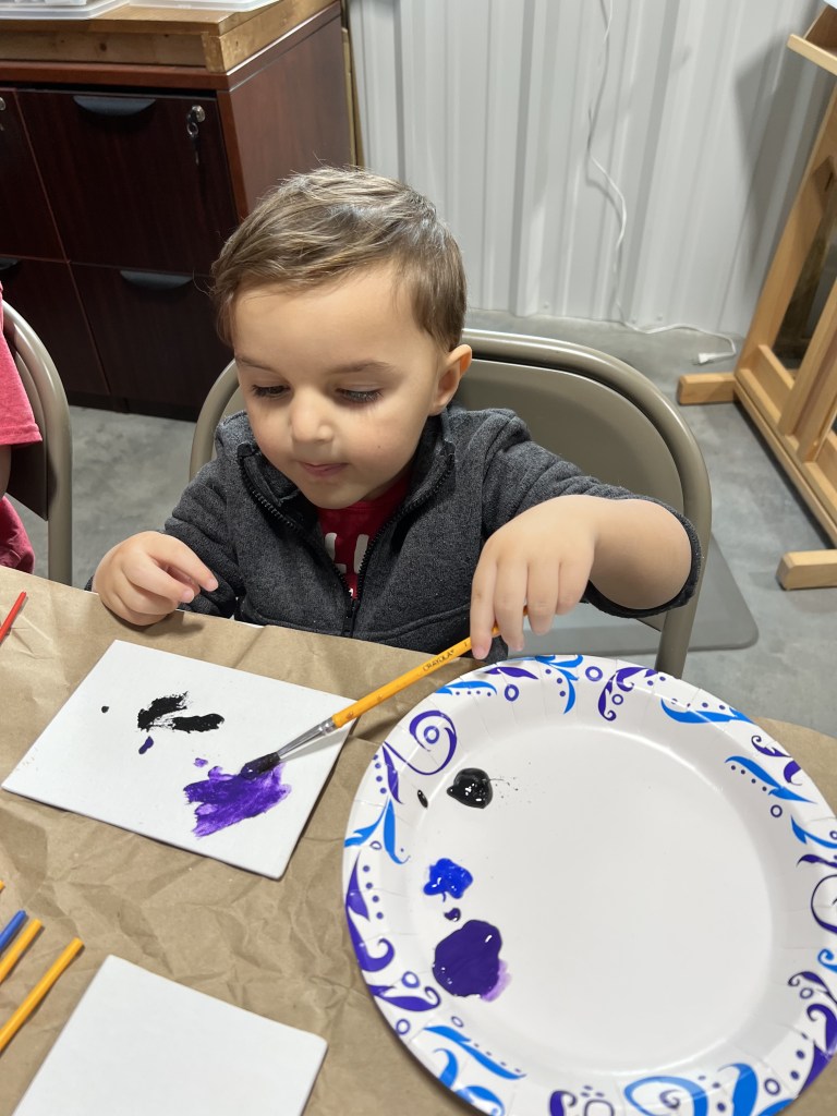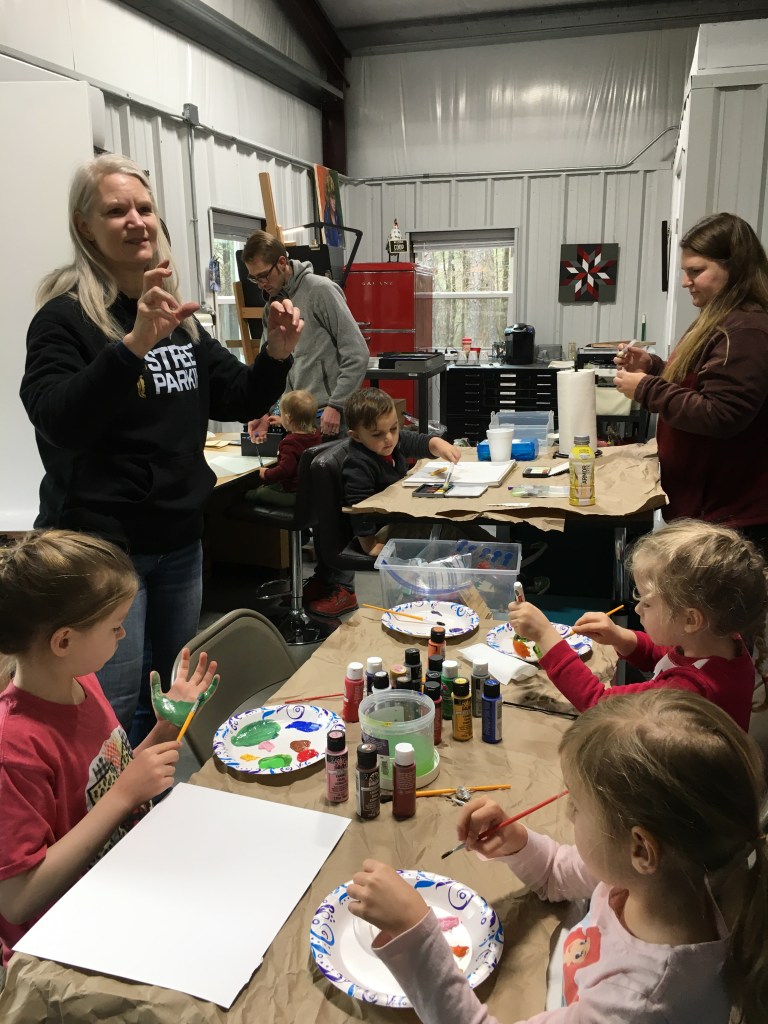 I had the wonderful opportunity to host four children from the ages of 18months to 7 years old in my studio this week. Their parents and grandmother joined in for the fun. Along with these guests, my daughter and her young son joined in. My daughter is also an accomplished artist, and I was grateful for her extra hands and sharing of knowledge.