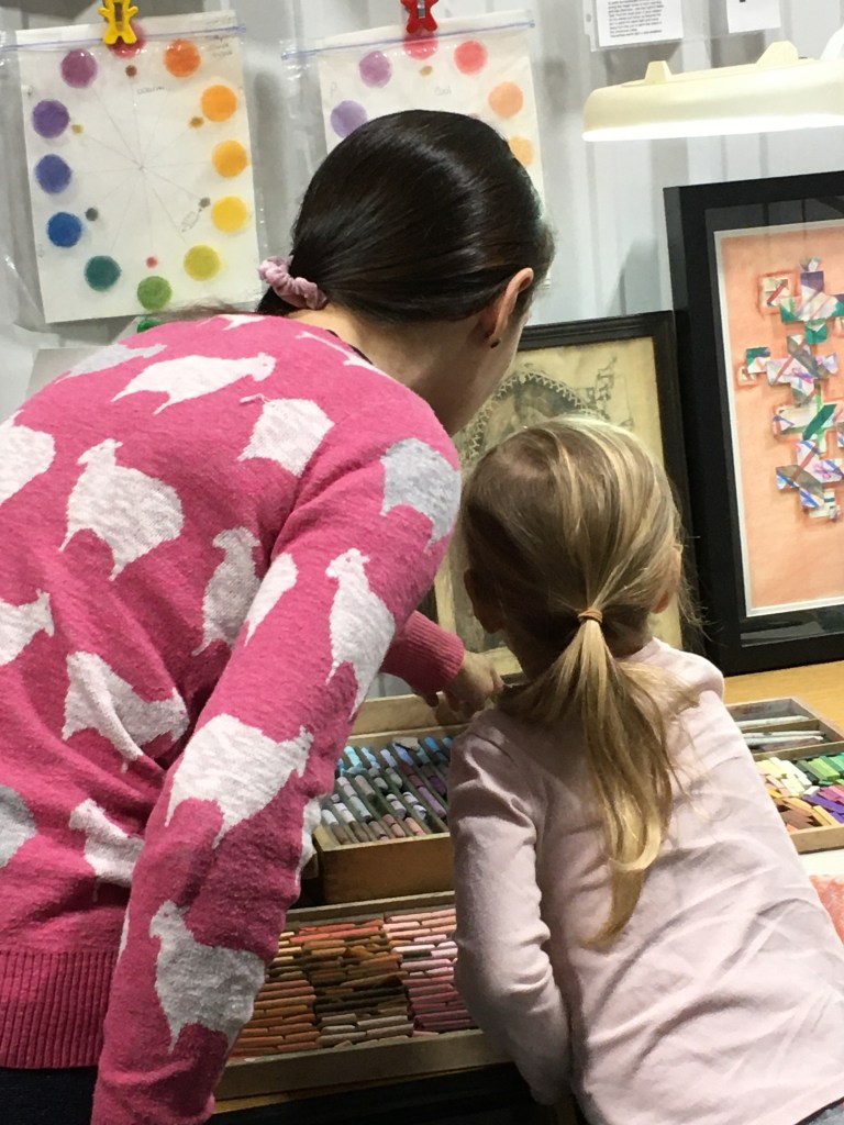 We set up stations so the children could try pastels, acrylics, watercolors, markers and create a Christmas Ornament. It was so fun watching them experiment with different papers, textures, and mediums. They created so many wonderful and imaginative pieces over the course of several hours. There could be some promising Picasso’s in the bunch!