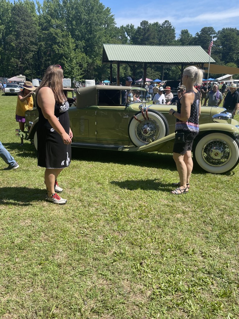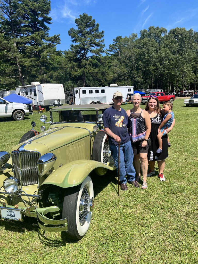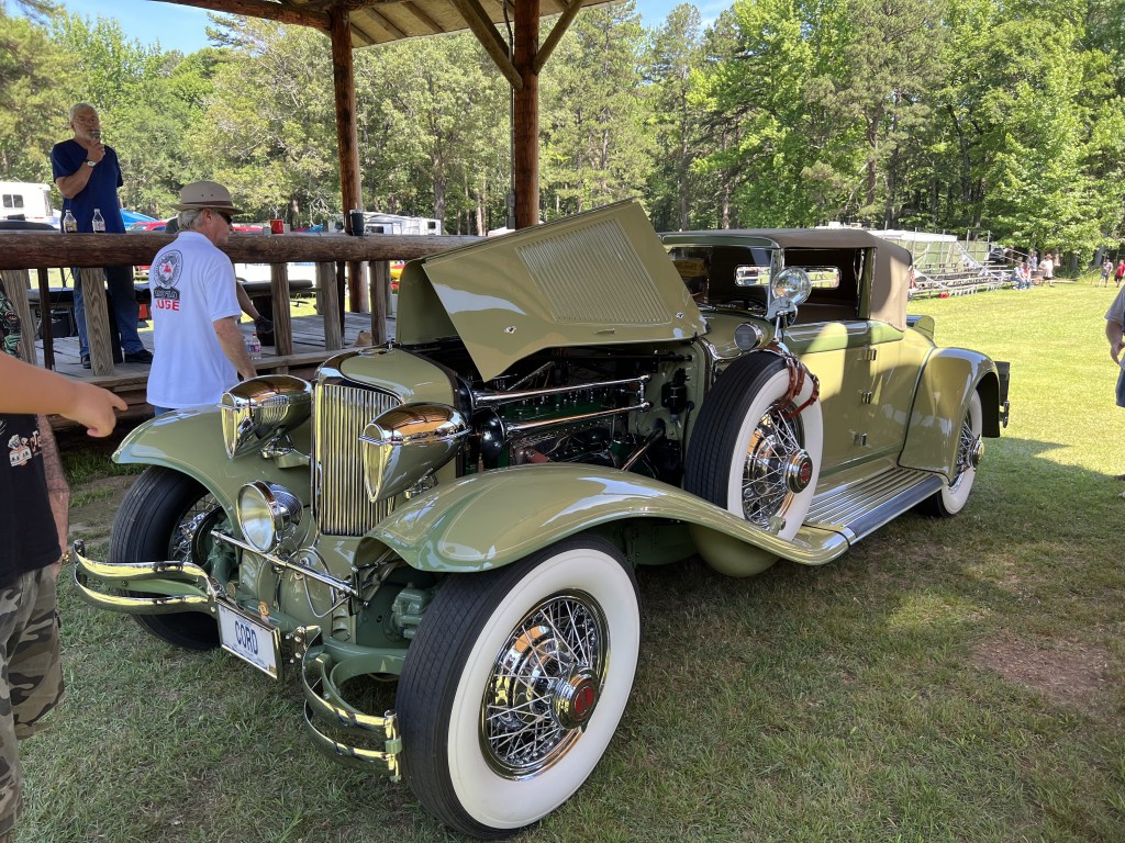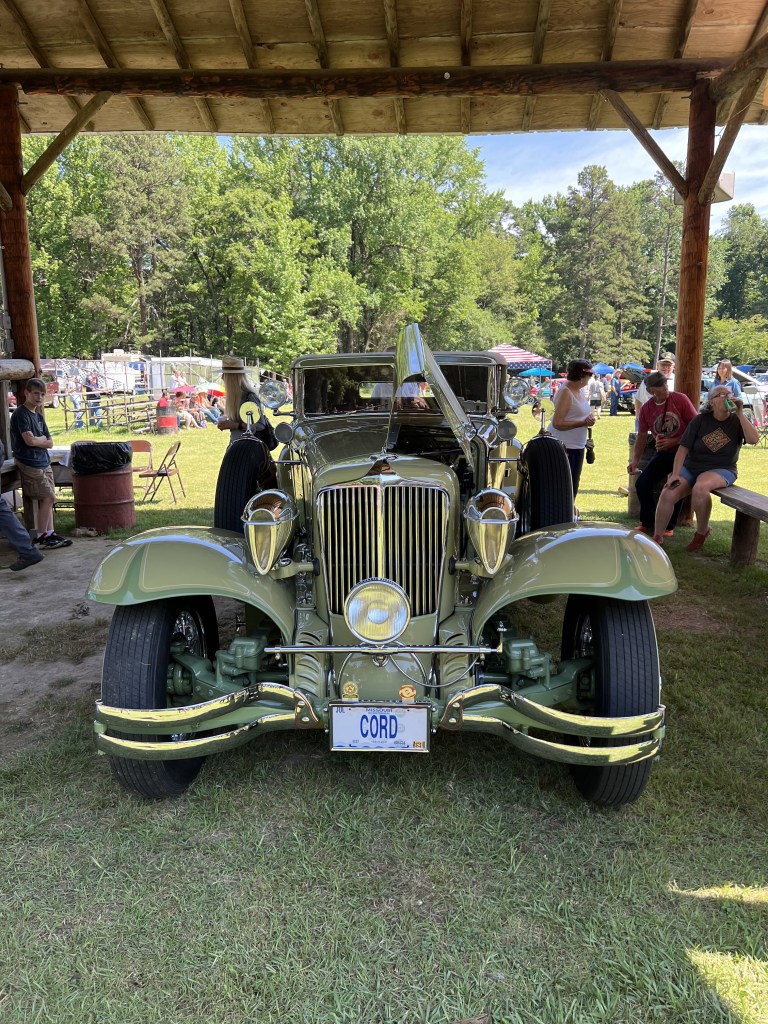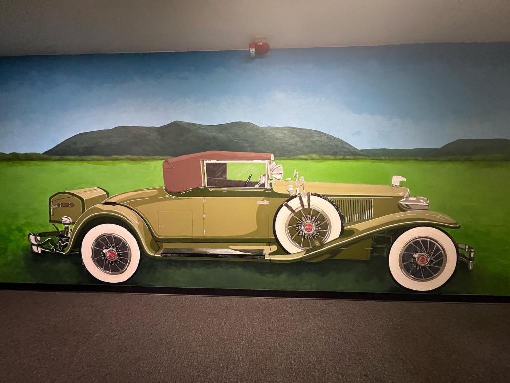 Last week, Evelyn and I completed the 1931 CORD L-29 Cabriolet mural at The Museum of Automobiles on Petit Jean Mountain, AR. Today at the 65th Annual Petit Jean Swap Meet and Car Show, we met up with G.O., the owner of the CORD. It was the first time she had seen the mural in person, talk about being nervous! G.O. absolutely loved the mural and said he couldn’t be more proud. G.O. brought the CORD to the show and as his son was getting ready to pull the car away from the judge’s booth, I was gifted with a ride! As you can see from the video, I was like a kid in the candy store.