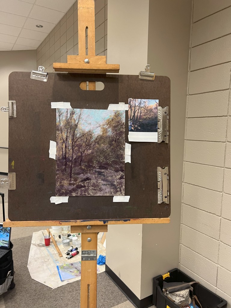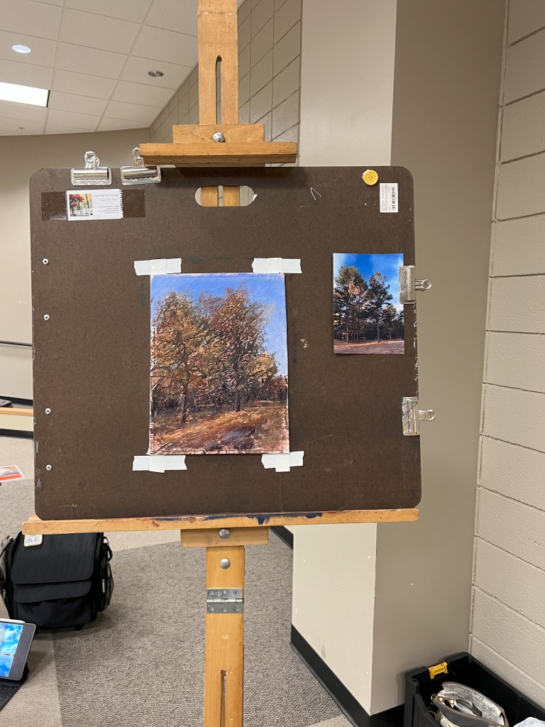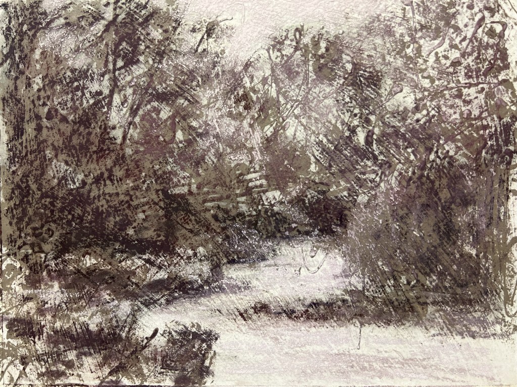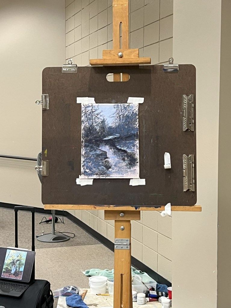 I spent three days with the Arkansas Pastel Society taking a workshop with Tom Christopher. I took his workshop last year and I’ve been applying his techniques for adding texture to my landscape paintings. I decided to take the workshop again as I wanted to focus on; 1) tactics for applying pastel to the texture, 2) what to do if the drips of paint are too heavy or land in the wrong place, and 3) the paper towel dabbing technique. Tom talked about the importance of strong value studies, so I worked on three of them, one I added color to. Something I learned from the first workshop, we are not there to create a finished painting, rather to look at each painting as an opportunity to learn and practice. However, sometimes we do walk away with paintings that we can finish in the studio. I’ll post again if I finish any of these four studies.