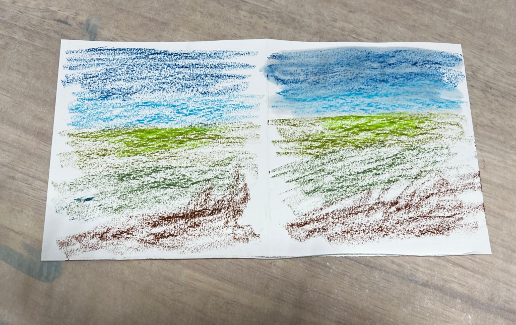 According to the product instructions, water or other oil painting mediums could be used to wash the pastel. To compare the effects, I used water on the left side and alcohol on the right: