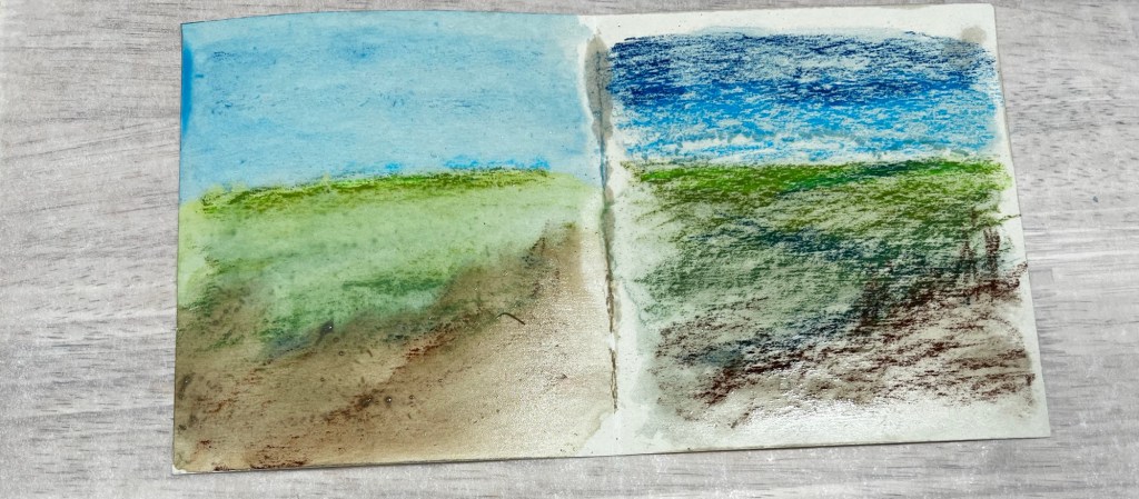 • The pastels blended effectively with a brush, as recommended on the box. I also experimented by overlapping colors in the sky.