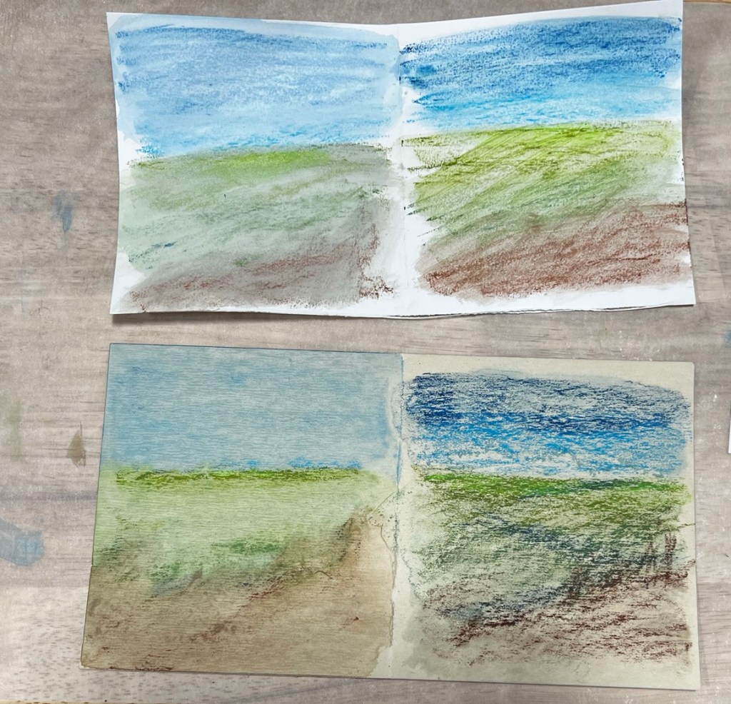 • Water was more effective in dissolving the pastels, creating a smoother and more fluid wash.